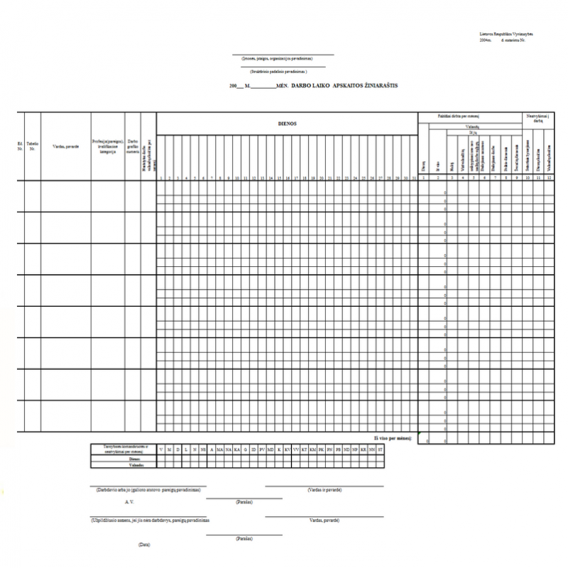 - Darbo laiko apskaitos žiniaraštis.