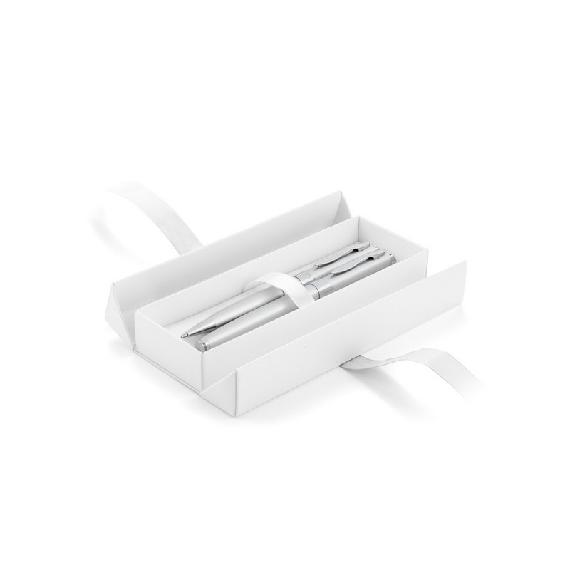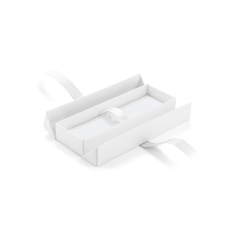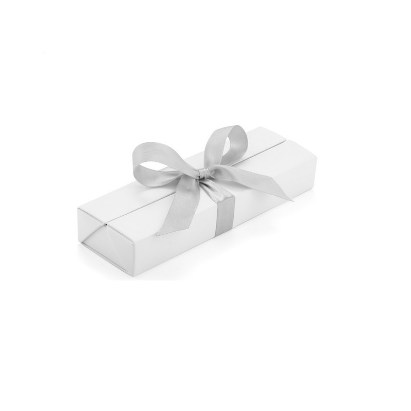 Dėžutė rašikliui E26 balta su sidabro sp. kaspinu